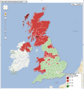 Gordon’s interpretation of the third map, which shows average life expectancy by region, is another egregious abuse of data. He asks us to believe that people in Scotland die younger than people in the south of England because they are less wealthy. Looking at the map and applying random knowledge of the UK we could just as easily say that life expectancy is related to weather, or genetics, or culture.